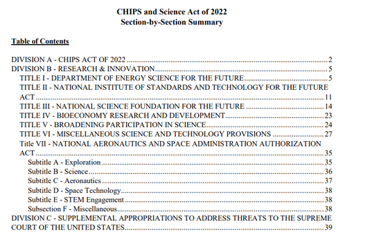 簡單來說,這份《芯片與科學(xué)法案》是由三項(xiàng)法案合并而成的一個(gè)大法案:A 部分是“2022年CHIPS 法案”;B部分是《研發(fā)、競爭和創(chuàng)新法》;C 部分是“2022 年最高法院安全資金法案”。其中A和B部分最為關(guān)鍵。