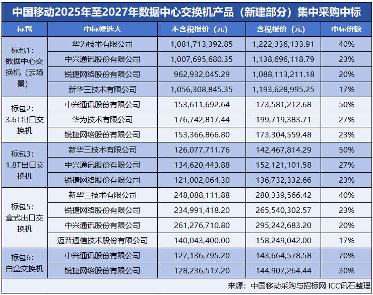 ICC訊 6月12日,中國移動2025-2027年數(shù)據(jù)中心交換機產(chǎn)品(新建部分)集中采購項目公布中標候選人。本次公示涉及標包1、2、3、5、6,標包4因評審未完成暫未公示。華為、中興、銳捷、新華三、邁普五家中標。