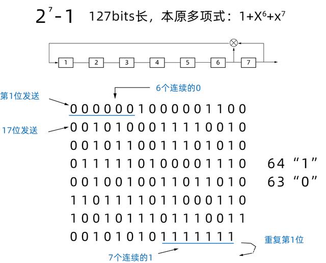 在圖中可以看到,PRBS7最長是127bit(27-1), 理論上來說,7bit的2進制碼,一共會有27個不同組合。但是如果碼流全部為‘0’的時候,經(jīng)過異或運算,輸入到寄存器第一位的值還是0, 這樣移位寄存器將會一直輸出為零,移位寄存器被死鎖。所以PRBS碼流不能全部為零。另外,PRBS7 碼流中最長的連續(xù)‘1’個數(shù)為7個,最長的連續(xù)‘0’個數(shù)為6個。127bit的連續(xù)碼流中,一共有64個‘1’,63個‘0’。