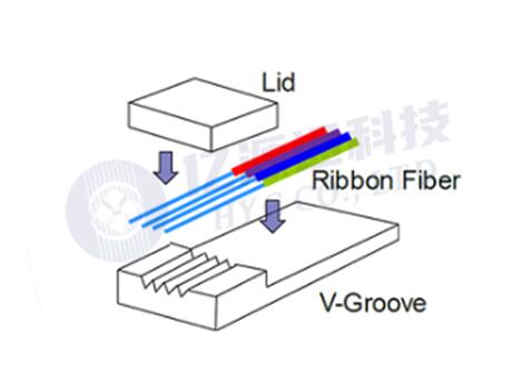 光纖陣列FA,即Fiber Array,利用V形槽(即V槽,V-Groove)基片,把一束光纖或一條光纖帶按照規(guī)定間隔安裝在基片上,所構(gòu)成的陣列。光纖陣列的加工過程是,除去光纖涂層的裸露光纖部分被置于該V形槽中,由被加壓器部件所加壓,并由粘合劑所粘合,最后研磨表面并拋光至所需精度,組裝成為連接光器件和光纖之間的重要耦合組件。