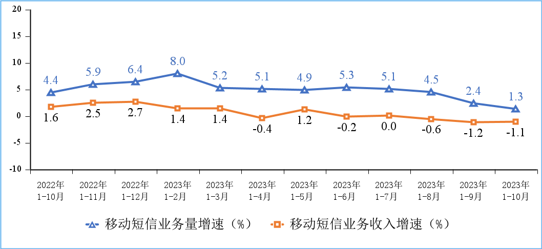 移動語音和短信業(yè)務(wù)持續(xù)收縮。1-10月份,移動電話去話通話時長完成1.87萬億分鐘,同比下降1.9%;固定電話主叫通話時長完成664.7億分鐘,同比下降4.5%。1-10月份,全國移動短信業(yè)務(wù)量同比增長1.3%,增速較前三季度回落1.1個百分點;移動短信業(yè)務(wù)收入同比下降1.1%,降幅較前三季度收窄0.1個百分點。