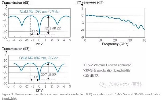 圖三中利用一個(gè)市面上的InP IQ調(diào)制器來(lái)說(shuō)明波長(zhǎng)相關(guān)的直流偏置電壓特性。在1528nm時(shí)需要5V的直流偏置電壓來(lái)得到1.4V的半波電壓,而在1567nm時(shí),需要9V的直流偏置電壓來(lái)保持1.4V的半波電壓。另外,這一調(diào)制器也達(dá)到了>30-GHz的調(diào)制帶寬以及30dB的消光比ER。