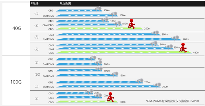 OM5光纖跳線的波長是850/1300nm,并且至少可以支持4個(gè)波長。OM3和OM4的通常工作波長是850nm和1310nm,且一次只支持1個(gè)波長,在相同的波長窗口中,這種多模光纖跳線的傳輸距離也不相同。