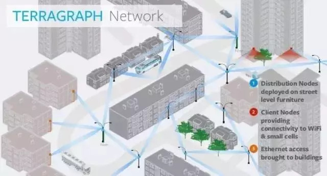 Terragraph屬于網(wǎng)絡(luò)回傳設(shè)備。它采用60GHz毫米波,將設(shè)備掛在城市的路燈桿上,組成網(wǎng)狀的回傳網(wǎng)絡(luò),節(jié)點(diǎn)間交叉連接,互為備份,不會(huì)因?yàn)槟骋还?jié)點(diǎn)故障而導(dǎo)致網(wǎng)絡(luò)中斷,以代替城市光纖鋪設(shè),降低成本,提升網(wǎng)絡(luò)建設(shè)速度。