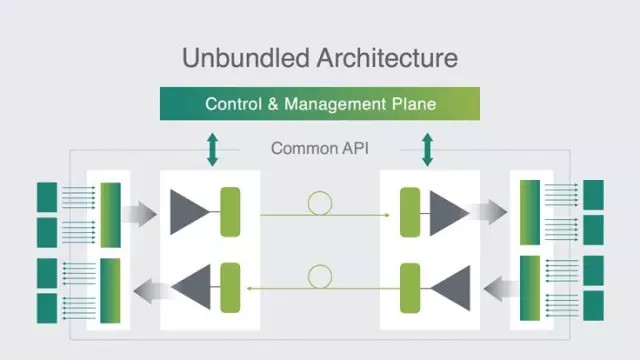 這種Open Packet DWDM系統(tǒng)是一個(gè)開(kāi)放的線路系統(tǒng),允許任何設(shè)備商向系統(tǒng)貢獻(xiàn)新的軟件和硬件。在初始階段,這個(gè)開(kāi)放線路系統(tǒng)里的每一個(gè)組件包含YANG數(shù)據(jù)建模語(yǔ)言,并為控制面軟件提供開(kāi)放的北向接口。它可將來(lái)自交換機(jī)或路由器的數(shù)據(jù)信號(hào)根據(jù)相應(yīng)的信令格式重新組包傳送,支持地鐵數(shù)據(jù)中心互連和長(zhǎng)途部署。