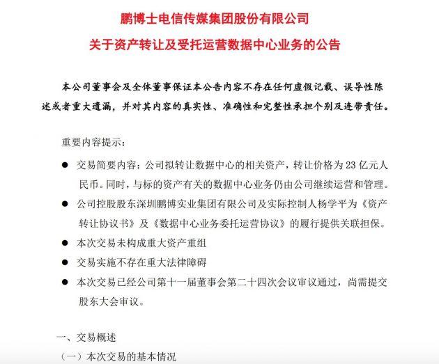 4月28日消息,鵬博士發(fā)布關(guān)于資產(chǎn)轉(zhuǎn)讓及受托運(yùn)營(yíng)數(shù)據(jù)中心業(yè)務(wù)的公告,擬向平盛國(guó)際金融控股有限公司、錦泉元和投資管理有限責(zé)任公司轉(zhuǎn)讓數(shù)據(jù)中心的相關(guān)資產(chǎn),轉(zhuǎn)讓價(jià)格為23億元人民幣。同時(shí),與標(biāo)的資產(chǎn)有關(guān)的數(shù)據(jù)中心業(yè)務(wù)仍由公司繼續(xù)運(yùn)營(yíng)和管理。
