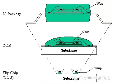 下圖可以了解電子晶片封裝的的演進(jìn)歷史從→ IC封裝 → COB → Flip Chip (COG),尺寸越來越小。其中COB只能說是介于目前技術(shù)的中間過度產(chǎn)品。