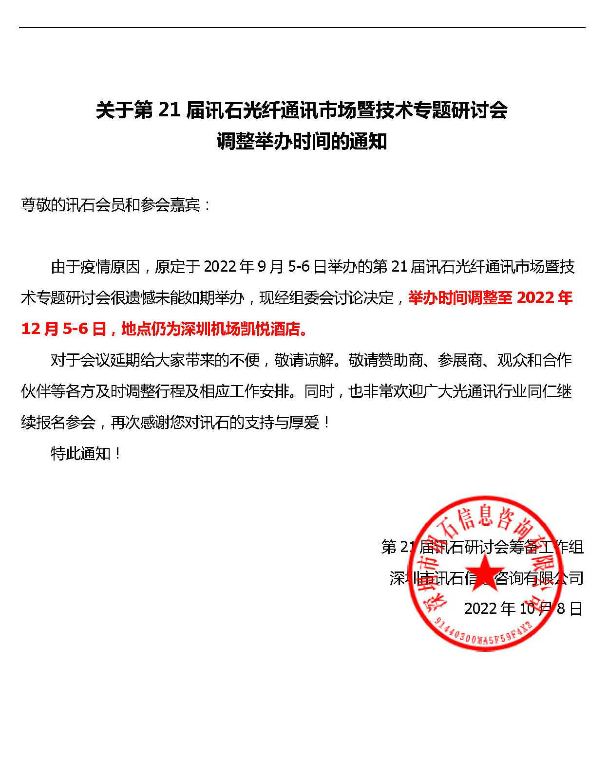 由于疫情原因,原定于2022年9月5-6日舉辦的第21屆訊石光纖通訊市場暨技術專題研討會很遺憾未能如期舉辦,現(xiàn)經(jīng)組委會討論決定,舉辦時間調(diào)整至2022年12月5-6日,地點仍為深圳機場凱悅酒店。