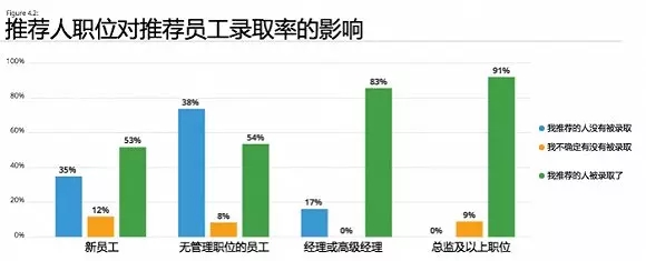 就員工推薦的成功率而言,報(bào)告發(fā)現(xiàn),員工本人的職位越高,推薦的成功率就越高。與此同時(shí),越資深的員工也有越強(qiáng)烈的推薦意愿。