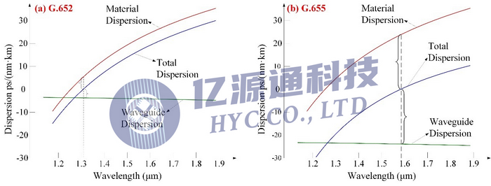常規(guī)石英光纖的損耗譜如圖3所示,它的第一、二、三傳輸窗口分別以850nm、1310nm和1550nm為中心,其中850nm是最早的多模光纖通信系統(tǒng)所采用的傳輸波長(zhǎng);1310nm是常規(guī)單模光纖G.652的零色散點(diǎn)位置,如圖4(a)所示,光纖中的材料色散和波導(dǎo)色散在此波長(zhǎng)處相互抵消;1550nm則是石英光纖的損耗最低處,為了克服G.652光纖在此處色散較大的問(wèn)題,人們開(kāi)發(fā)了G.655光纖,將光纖的零色散點(diǎn)設(shè)置在偏離1550nm不遠(yuǎn)處,如圖4(b)所示,這樣可以在1550nm波段獲得低色散,又不會(huì)在DWDM傳輸時(shí)產(chǎn)生四波混頻、交叉相位調(diào)制等非線性效應(yīng)。
