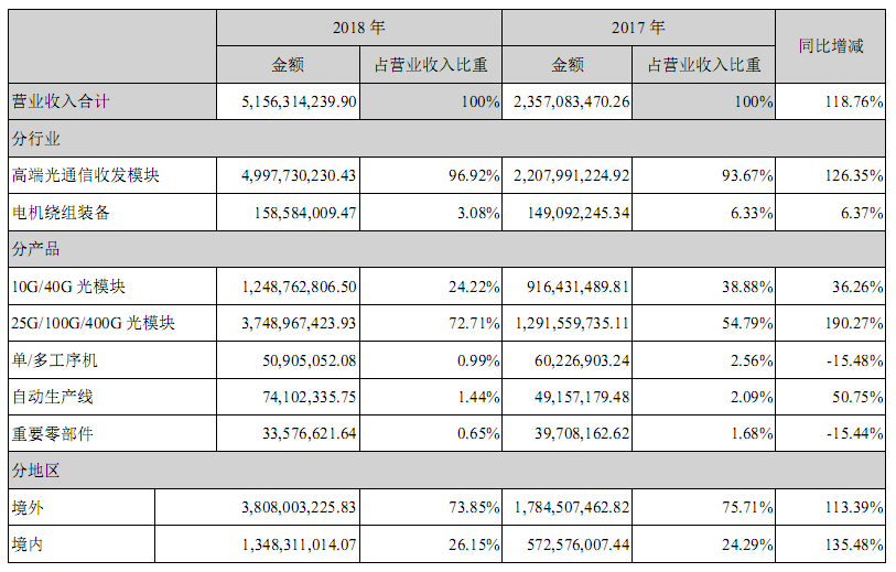 中際旭創(chuàng)2018年?duì)I收51.56億 位居全球光模塊領(lǐng)先地位