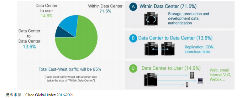 根據(jù)思科(Cisco)公司預(yù)測,全球超大型數(shù)據(jù)中心數(shù)量預(yù)計(jì)由2016年的338個(gè)增長至2021年的628個(gè)(占比達(dá)53%),復(fù)合年增長率達(dá)13%;全球數(shù)據(jù)中心總流量將由2016年的6819EB增至2021年的20555EB,復(fù)合年增長率達(dá)23%,由數(shù)據(jù)中心內(nèi)部流量和數(shù)據(jù)中心互聯(lián)流量組成的東西向流量(East-West Traffic,橫向流量)占數(shù)據(jù)中心總流量約85%。