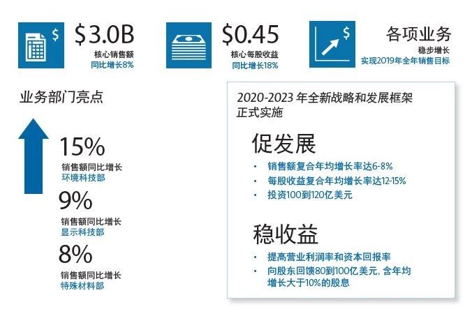 “第二季度的業(yè)績表現(xiàn)反映出我們高效地執(zhí)行并完成了康寧在2016-2019年間的戰(zhàn)略和資本配置框架目標,我們的業(yè)務增長超過了市場增速,證明了我們的產(chǎn)品組合在面對宏觀經(jīng)濟阻力下的適應力。我們希望在全新的2020-2023年戰(zhàn)略與發(fā)展框架實施下繼續(xù)保持強勁的業(yè)績?!?