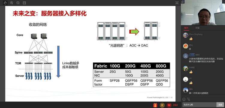 其中,華為數(shù)通產(chǎn)品線(xiàn)產(chǎn)品規(guī)劃專(zhuān)家謝耀輝博士發(fā)表了主題為《DCN最新發(fā)展情況與趨勢(shì)》的演講,提到DCN的演進(jìn)規(guī)律與未來(lái)趨勢(shì),并提出服務(wù)器接入“光退銅進(jìn)”的新概念,指出AOC正面臨變局,OTT通過(guò)單聯(lián)柜和雙聯(lián)柜在向低成本、低功耗、低時(shí)延的DAC轉(zhuǎn)變。對(duì)于未來(lái)趨勢(shì),謝博士認(rèn)為,400GE是DCN演進(jìn)的大代;接入需要DSFP小型化封裝;產(chǎn)業(yè)需聚焦,這樣才可能上量,把成本和功耗的競(jìng)爭(zhēng)力做出來(lái)。在演講結(jié)束還解答了觀眾的熱烈提問(wèn),觀看直播才能收獲全部信息,歡迎關(guān)注訊石每一次的線(xiàn)上線(xiàn)下會(huì)議活動(dòng)。