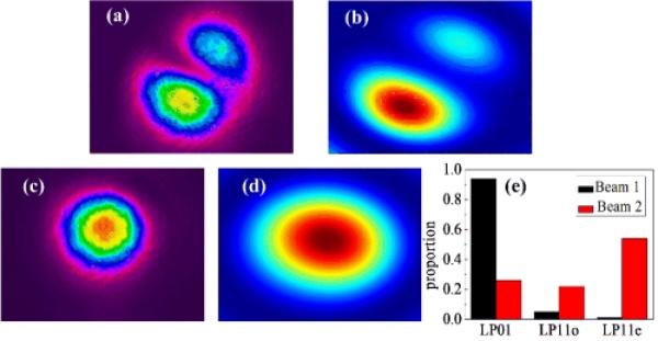 圖2.(a)、(c)SPGD算法最小值和最大值收斂后的紅外相機(jī)光場分布;(b)、(d)模式重構(gòu)出的光場分布;(e)各種本征模式占比