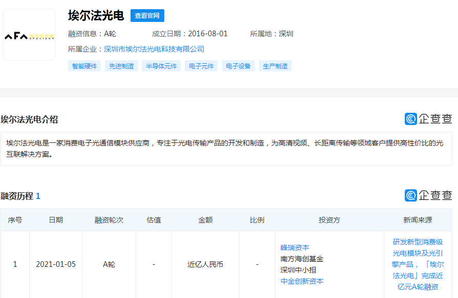 ICC訊 企查查APP顯示,近日,新型光模塊及光引擎供應(yīng)商深圳市埃爾法光電科技有限公司(以下簡(jiǎn)稱“埃爾法光電”)完成近億元A輪融資,由峰瑞資本、中金創(chuàng)新聯(lián)合領(lǐng)投,深圳中小擔(dān)、南方海創(chuàng)基金跟投,華峰資本擔(dān)任獨(dú)家財(cái)務(wù)顧問。