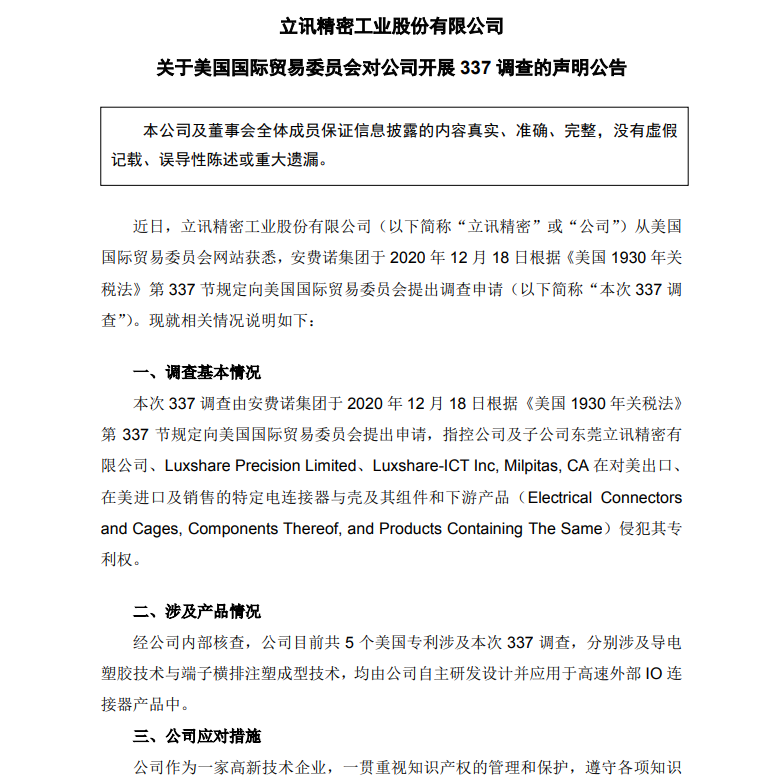 12月21日,立訊精密發(fā)布關(guān)于美國國際貿(mào)易委員會對公司開展337調(diào)查的聲明。經(jīng)初步判斷,本次337調(diào)查對公司目前的生產(chǎn)、經(jīng)營不會造成實質(zhì)性影響。