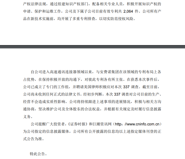 公告表示,自公司進(jìn)入高速通訊連接器領(lǐng)域以來,與安費諾集團(tuán)在該領(lǐng)域的專利布局上各占優(yōu)勢,在保持積極開放的溝通下,對彼此專利各有所主張。在獲悉本次事件后,公司已成立了專門的工作組,并聘請美國律師積極應(yīng)對本次337調(diào)查。截至目前,公司尚未收到任何正式的法律文書。經(jīng)初步判斷,本次337調(diào)查對公司目前的生產(chǎn)、經(jīng)營不會造成實質(zhì)性影響。