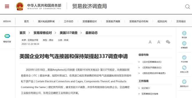 公告指明,近日立訊精密從美國國際貿(mào)易委員會網(wǎng)站獲悉,安費諾集團(tuán)于12月18日根據(jù)《美國1930年關(guān)稅法》第337節(jié)規(guī)定向美國國際貿(mào)易委員會提出調(diào)查申請。