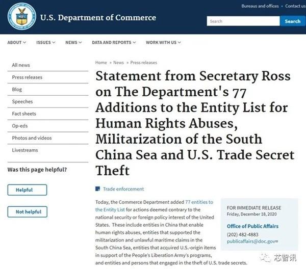 ICC訊(編輯:Debi)美國當(dāng)?shù)貢r間12月18日晚間,美國商務(wù)部正式宣布將中芯國際及其子公司等59家中國實體企業(yè)列入“實體清單”,而近日美國商務(wù)部正式公布了最新被列入實體清單的77家實體,該名單于22日正式執(zhí)行: