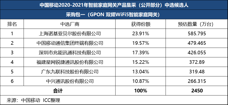 ICC訊(編輯:Aiur)今日,中國(guó)移動(dòng)公布2020-2021年智能家庭網(wǎng)關(guān)產(chǎn)品集中采購(gòu)(公開(kāi)部分)項(xiàng)目的采購(gòu)包二GPON-雙頻Wifi6智能家庭網(wǎng)關(guān)產(chǎn)品的中標(biāo)候選人,該采購(gòu)包預(yù)估數(shù)量為800萬(wàn)臺(tái),諾基亞貝爾、中國(guó)移動(dòng)終端公司、兆能訊通和星網(wǎng)銳捷冠共四家設(shè)備商中標(biāo)入選