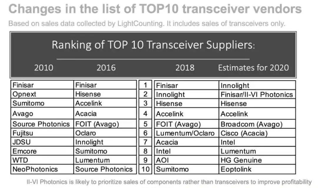 2020年初,光通信市場(chǎng)調(diào)研機(jī)構(gòu)LightCounting指出,中國(guó)的光模塊供應(yīng)商將在2020年主導(dǎo)全球市場(chǎng),市場(chǎng)占比將超過(guò)50%。同時(shí),這一年將首次出現(xiàn)5家中國(guó)廠商同時(shí)進(jìn)入全球前十,分別是旭創(chuàng)、海信、光迅、華工正源和新易盛,而2010年只有一家。