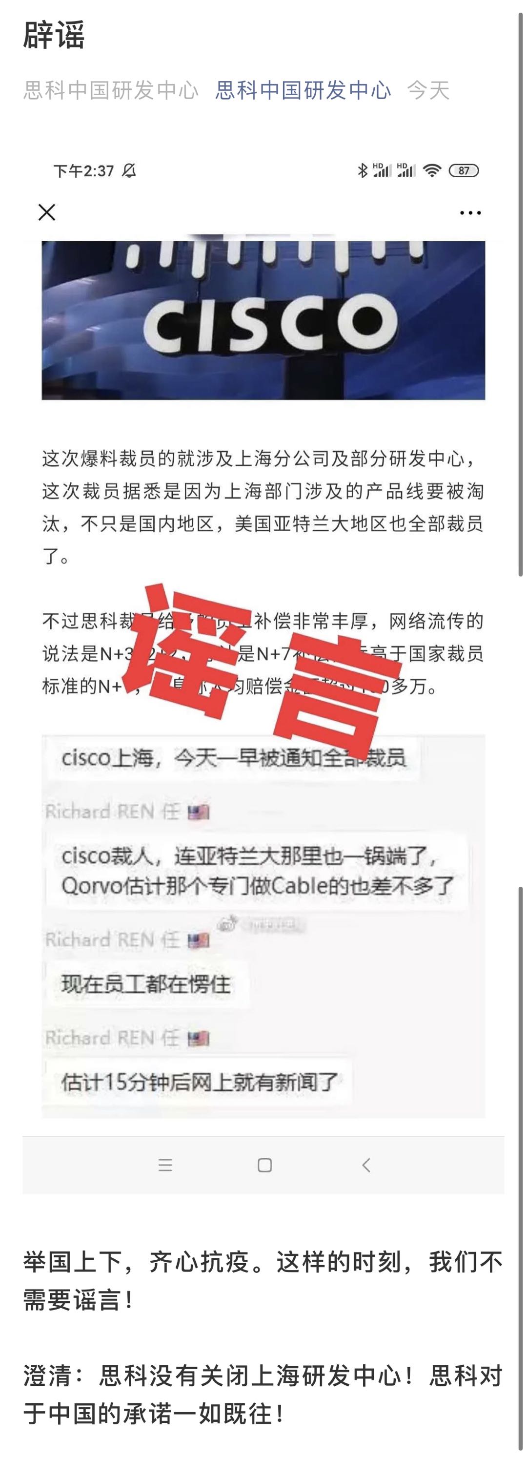 ICCSZ訊思科中國研發(fā)中心公眾號發(fā)布辟謠稱,并沒有關(guān)閉上海研發(fā)中心,思科對于中國的承諾一如既往。