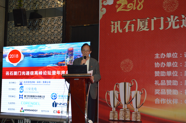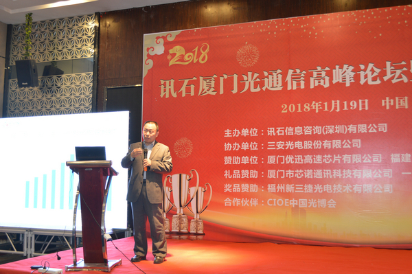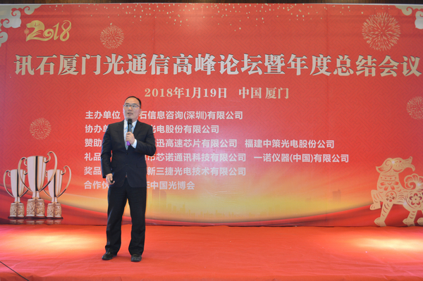 Iccsz訊 白駒過隙,時光荏苒,2017年已經(jīng)結(jié)束,我們迎來嶄新的2018年!正逢新年喜慶,1月19日《2018訊石廈門光通信高峰論壇暨年度總結(jié)會議》在廈門成功舉辦,145家企業(yè)超過280人齊聚廈門,歡度訊石2017尾牙,展望全球2018!本次會議由訊石信息咨詢(深圳)有限公司主辦、三安光電股份有限公司協(xié)辦,廈門優(yōu)迅高速芯片有限公司和福建中策光電股份公司支持,論壇圍繞光通信模塊、器件、芯片和材料等議題展開,多位光通信行業(yè)大咖先后向觀眾講述市場動態(tài)和技術(shù)發(fā)展。還要感謝廈門市芯諾通訊有限公司、一諾儀器(中國)有限公司、福州新三捷光電技術(shù)有限公司和CIOE中國光博會對本次論壇提供的幫助,大家一起將論壇氛圍推向高峰。