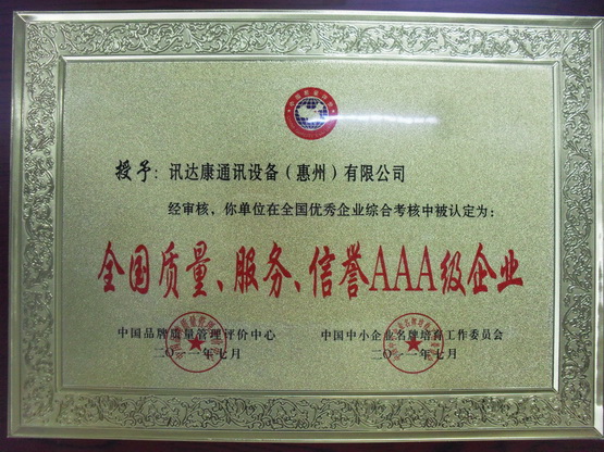 訊達(dá)康通訊設(shè)備(惠州)有限公司被中國(guó)品牌質(zhì)量管理評(píng)價(jià)中心、中國(guó)中小企業(yè)名牌培育工作委員會(huì)認(rèn)定為AAA級(jí)企業(yè)。