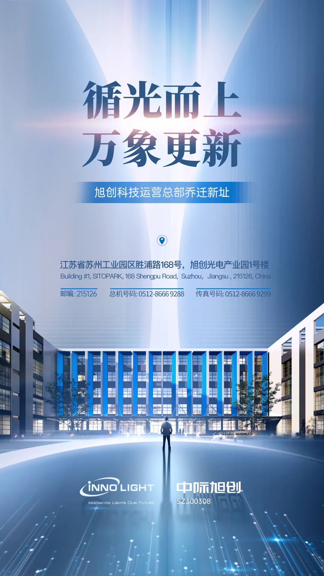 2022年3月7日,旭創(chuàng)科技運營總部正式遷往新址——蘇州市工業(yè)園區(qū)勝浦路168號,蘇州旭創(chuàng)光電產(chǎn)業(yè)園(SITOPARK)1號樓。