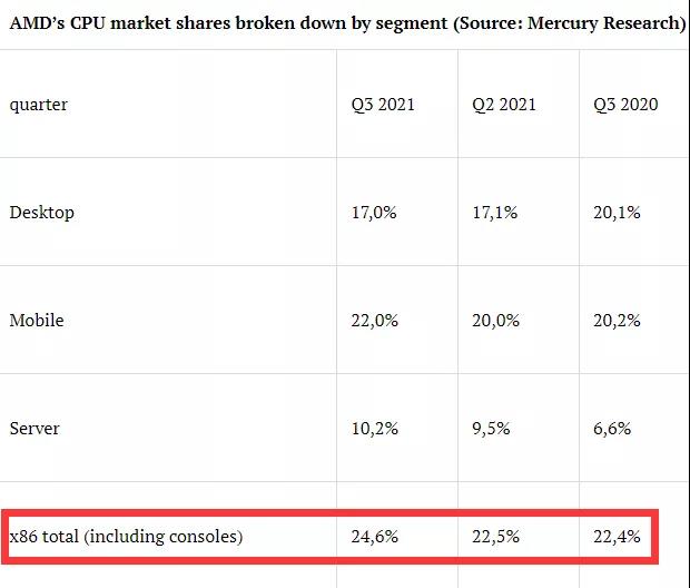 在英特爾跟隨西方政客炒作新疆議題之際,其市場份額也正被競爭對(duì)手AMD侵蝕。市場調(diào)研機(jī)構(gòu)Mercury Research的數(shù)據(jù)顯示,2021年第三季度,AMD在X86 CPU市場上的整體份額環(huán)比增加了2.1個(gè)百分點(diǎn),達(dá)到24.6%,這是AMD歷史上第二高的紀(jì)錄,15年前該公司曾創(chuàng)下最高紀(jì)錄25.3%。