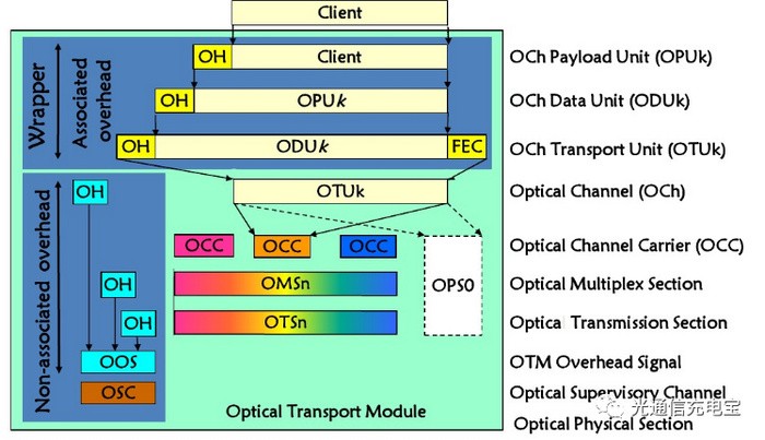 如下圖所示,OTN將整個光層分為光通道層(OCH),光復(fù)用段層(OMS),光傳輸段層(OTS)。它們在光網(wǎng)絡(luò)中分別對應(yīng)的范圍如圖1,OCH指的是端到端的OTU之間部分,OMS指的是OMU和ODU之間,OTS指OLA與OLA之間。其中光通道層又分為三個子層:光通道數(shù)據(jù)單元(ODUk),光通道傳送單元(OTUk)及光通道凈荷單元(OPU)。