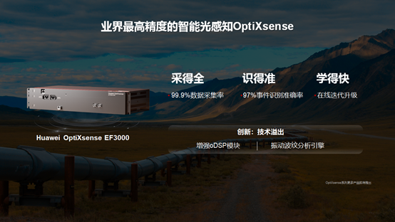 油氣管線作為國家能源輸送的大動脈,隨著管線里程的增長,“人工+自動‘’的新巡線方式已成為迫切需求。華為將領(lǐng)先的光技術(shù)應(yīng)用于光纖傳感領(lǐng)域,打造了全新的智能光感知產(chǎn)品系列Huawei OptiXsense。這款產(chǎn)品是目前業(yè)界識別準(zhǔn)確率領(lǐng)先的光纖振動傳感產(chǎn)品,將廣泛應(yīng)用于油氣管線場景,其具有采得全、識得準(zhǔn)、學(xué)得快的優(yōu)勢,該新品由三大核心技術(shù)支撐:
