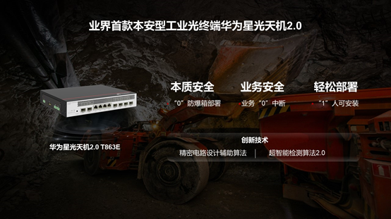 面向礦井和化工等高安全需求場景,華為推出了業(yè)界首款本安型工業(yè)光終端華為星光天機(jī)2.0,應(yīng)用于視頻回傳、傳感和機(jī)械控制等業(yè)務(wù)承載。相比上一代產(chǎn)品,華為星光天機(jī)2.0實現(xiàn)了網(wǎng)絡(luò)設(shè)備的本質(zhì)安全,業(yè)務(wù)安全和輕松部署: