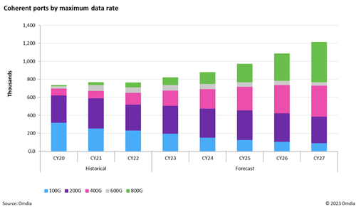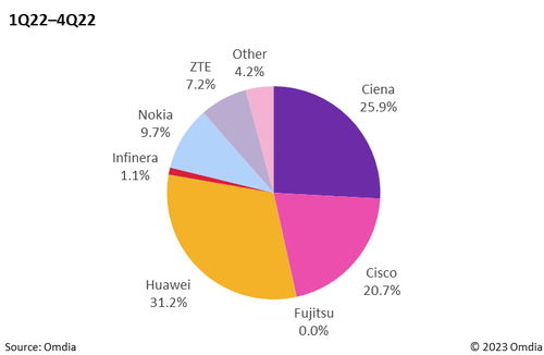 ICC訊(編譯:Nina)近日,領(lǐng)先的技術(shù)研究公司Omdia發(fā)布了2022年第四季度(4Q22)100G+相干光設(shè)備端口數(shù)據(jù),并深入分析了100G或更高速率WDM市場(chǎng)。報(bào)告顯示,與2021年相比,400G出貨量增長(zhǎng)了55%,預(yù)計(jì)未來(lái)五年市場(chǎng)將保持高增長(zhǎng)。過(guò)去四個(gè)季度(1Q22-4Q22),華為在400G出貨量方面保持領(lǐng)先。