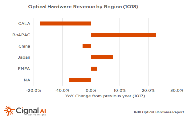 ICCSZ訊(編譯:Nina)根據(jù)研究公司Cignal AI的最新報告,2018年第一季度(Q118),全球光網(wǎng)絡硬件市場的增長集中在亞太地區(qū),尤其是中國以外的市場;EMEA(歐洲、中東和非洲)市場同比增長,大型設備供應商對老牌運營商未來支出走勢表示樂觀;北美市場光網(wǎng)絡支出持續(xù)下滑,表現(xiàn)弱于預期。