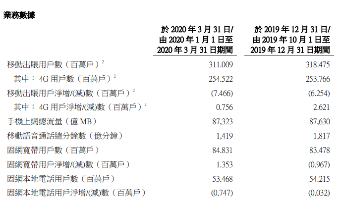 在移動業(yè)務方面,中國聯(lián)通自去年下半年起適時調(diào)整經(jīng)營策略,加強自律,堅持理性規(guī)范競爭,并從以往重點關注用戶增長數(shù)量,轉(zhuǎn)為重點關注用戶發(fā)展質(zhì)量和價值,深化轉(zhuǎn)型創(chuàng)新,嚴控營銷費用、無效低效產(chǎn)品和渠道,雖然移動業(yè)務發(fā)展短期會受到一定的影響,但相信有利于公司長遠發(fā)展和價值最大化。2020年第一季度,移動出賬用戶凈減747萬戶,達到3.11億戶,其中4G用戶達到2.55億戶。移動出賬用戶ARPU為人民幣40.0元。移動服務收入為人民幣377.49億元,比去年同期下降4.1%,跌幅較去年全年的-5.3%有所改善。