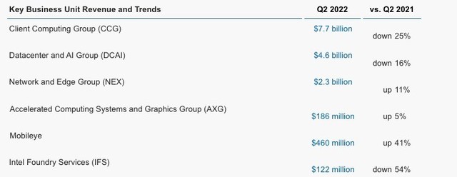 ICC訊 7月29日凌晨,英特爾公布了該公司的2022財(cái)年第二季度財(cái)報(bào)。財(cái)報(bào)顯示,英特爾英特爾客戶計(jì)算集團(tuán)第二季度凈營(yíng)收為76.65億美元,相比之下去年同期為102.53億美元,同比下降25%;數(shù)據(jù)中心和人工智能集團(tuán)第二季度營(yíng)收為46.49億美元,相比之下去年同期為55.47億美元,同比下降16%;網(wǎng)絡(luò)和邊緣集團(tuán)第二季度營(yíng)收為23.33億美元,相比之下去年同期為21.05億美元,同比增長(zhǎng)11%;英特爾加速計(jì)算系統(tǒng)和圖形業(yè)務(wù)部門第二季度營(yíng)收為1.86億美元,相比之下上年同期為1.77億美元,同比增長(zhǎng)5%;自動(dòng)駕駛部門Mobileye第二季度營(yíng)收為4.60億美元,相比之下上年同期為3.27億美元,同比增長(zhǎng)41%;代工服務(wù)事業(yè)部(Intel Foundry Services)第二季度營(yíng)收為1.22億美元,相比之下上年同期為2.64億美元,同比下降54%。
