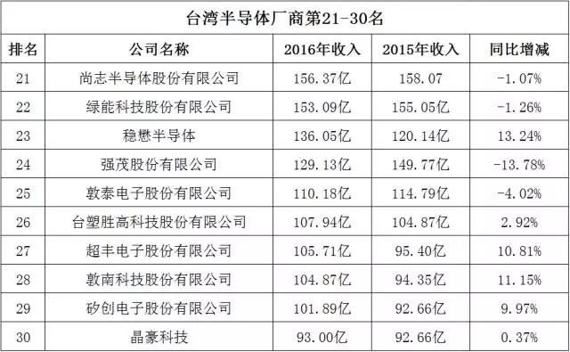 2016年臺灣上市半導體公司營收TOP 50