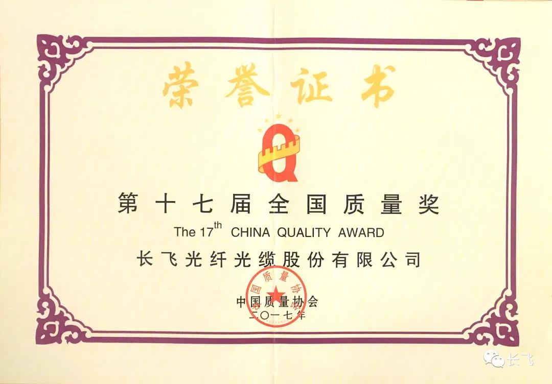 “全國(guó)質(zhì)量獎(jiǎng)”設(shè)立于2001年,由中國(guó)質(zhì)量協(xié)會(huì)依據(jù)《卓越績(jī)效評(píng)價(jià)準(zhǔn)則》國(guó)家標(biāo)準(zhǔn),綜合衡量企業(yè)文化、戰(zhàn)略、品牌、績(jī)效結(jié)果和社會(huì)責(zé)任等方面的表現(xiàn)進(jìn)行評(píng)審,是對(duì)實(shí)施卓越質(zhì)量經(jīng)營(yíng),在質(zhì)量、經(jīng)濟(jì)、社會(huì)效益等方面取得顯著成效的組織授予的在質(zhì)量方面的最高榮譽(yù)。2017年,長(zhǎng)飛公司作為首家中國(guó)光纖光纜行業(yè)企業(yè)榮獲第十七屆“全國(guó)質(zhì)量獎(jiǎng)”。