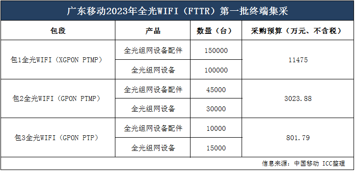 根據(jù)此前招標(biāo)公告,廣東移動(dòng)2023年全光WIFI(FTTR)第一批終端采購(gòu)預(yù)算金額為15300.67萬元(不含稅),其中標(biāo)包一:全光WIFI(XGPON PTMP),預(yù)算不含稅11,475.00萬元;標(biāo)包二:全光WIFI(GPON PTMP),預(yù)算不含稅3,023.88萬元;標(biāo)包三:全光WIFI(GPON PTP),預(yù)算不含稅801.79萬元。