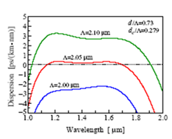 改變光子晶體光纖中的空氣孔大小與間距,光子晶體光纖的色散和色散斜率會急劇變化。如實(shí)心光纖的零色散點(diǎn)在1300nm波長附近,也可以通過設(shè)計(jì)將零色散點(diǎn)向長波長移動(dòng),但是難以獲得短波長的零色散。光子晶體光纖就可以實(shí)現(xiàn)傳統(tǒng)實(shí)心光纖無法實(shí)現(xiàn)的短波長零色散特性、寬波段的色散平坦特性(如圖2),以及超大負(fù)色散特性。
