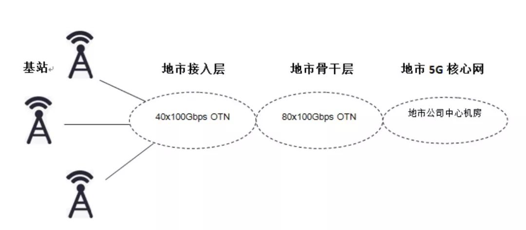 地市接入層作為承載網(wǎng)絡(luò)末端層級,一般為環(huán)網(wǎng)結(jié)構(gòu),將5G基站與地市骨干層相連,從而將5G業(yè)務(wù)上傳至地市核心網(wǎng)。地市接入層傳輸網(wǎng)實現(xiàn)5G基站接入,單臺設(shè)備按照接入8座基站設(shè)計,設(shè)備覆蓋廣、數(shù)量多、帶寬需求大,采用40x100Gbps容量OTN設(shè)備。