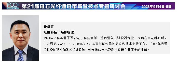 在9月4日的iFOC 2023專題《下一代光技術(shù)發(fā)展論壇》上,維度科技市場部經(jīng)理孫景群將發(fā)表主題為《打造一流測試產(chǎn)品,服務(wù)全球客戶》的演講,講述高商通信測試儀器的“國產(chǎn)替代”之路,助力中國智造走向世界。