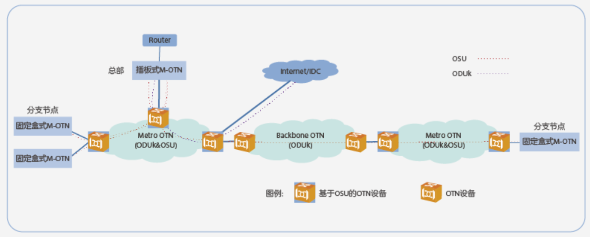 基于OSU的OTN設(shè)備是傳統(tǒng)OTN設(shè)備的優(yōu)化和擴(kuò)展,通過引入OSU技術(shù),可提供低成本、低時(shí)延、低功耗的以城域應(yīng)用為主的綜合業(yè)務(wù)承載方案。基于OSU的OTN設(shè)備在網(wǎng)絡(luò)中的部署如圖1所示。