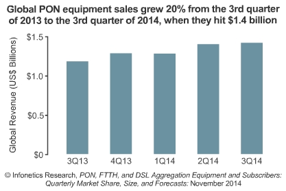 ICCSZ訊 2014年11月18日,市場(chǎng)調(diào)研公司Infonetics發(fā)布其最新的關(guān)于三季度PON、FTTH和DSL設(shè)備市場(chǎng)發(fā)展情況。