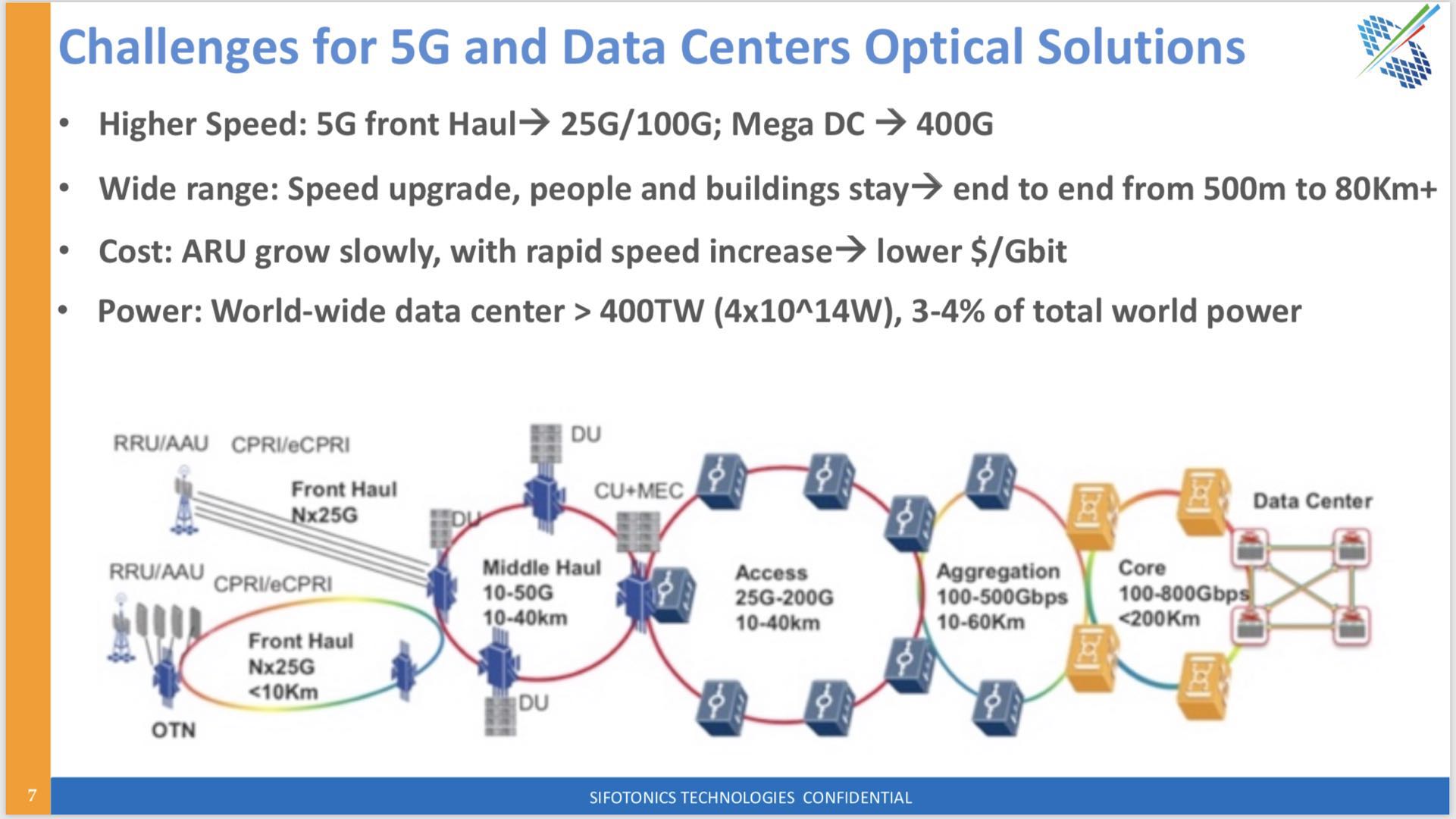 在可見的未來,5G網(wǎng)絡(luò)的布建涵蓋從前傳、中傳、后傳、城域及數(shù)據(jù)中心等端到端的整體建設(shè),面臨挑戰(zhàn)。傳輸速率的大幅提升包括5G前傳從10G提升到25G,甚至100G;數(shù)據(jù)中心從100G升級到400G. 伴隨傳輸速率提升帶來的傳輸距離的挑戰(zhàn),也面臨成本和功耗的壓力。運營商面臨流量大增但每用戶營收增長緩慢的矛盾,特別是中國所提倡的提速降費對運營商而言是一件非常有挑戰(zhàn)的政策,如何降低$/Gbit是運營商的重要考慮因素。 功耗是運營成本的重要因素,數(shù)據(jù)中心更是功耗龍頭。據(jù)統(tǒng)計,全球數(shù)據(jù)中心已占世界總功耗的3-4%,加上超大型數(shù)據(jù)中心數(shù)量不斷增加,功耗已超400TW。