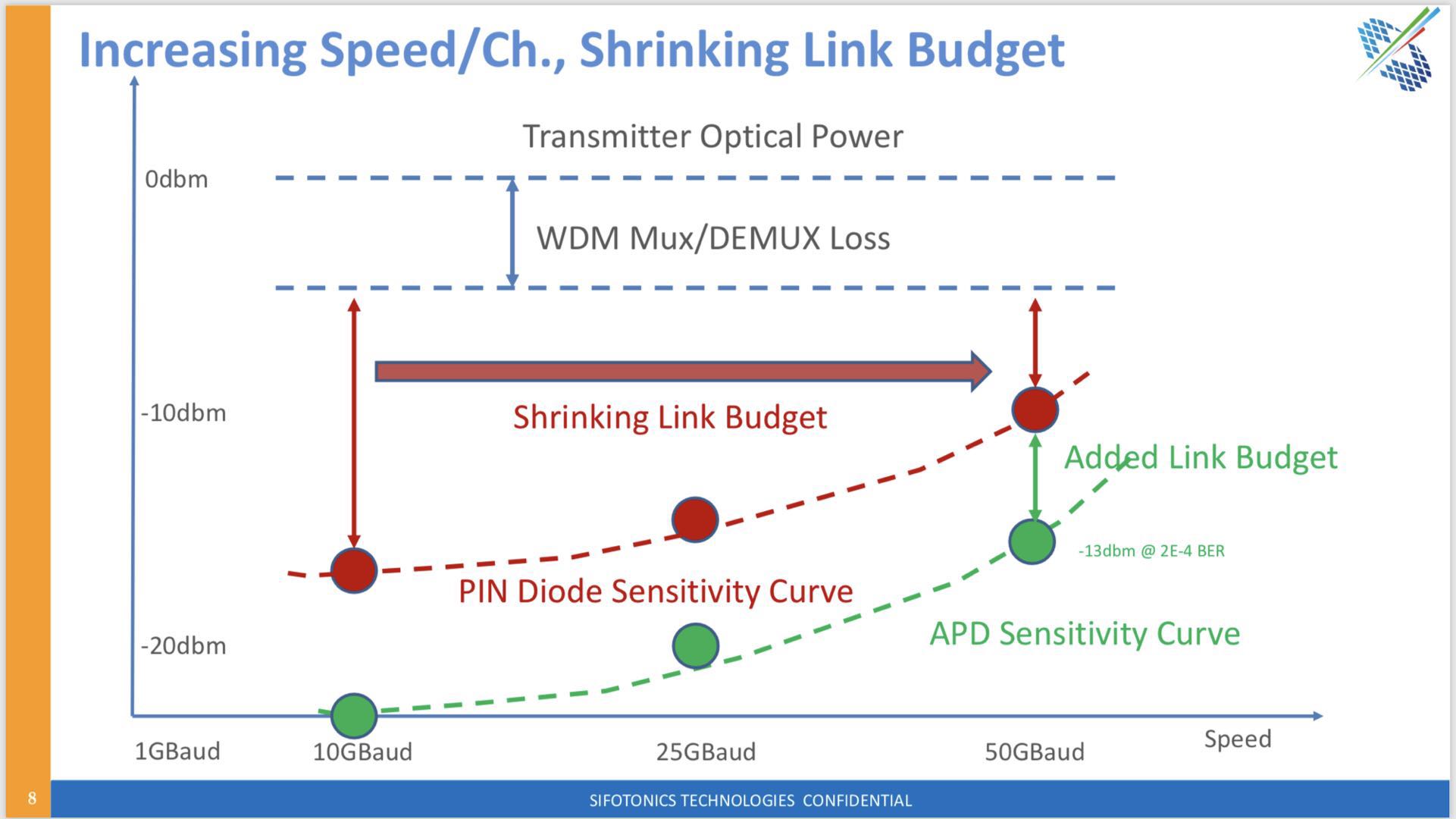 ”三流公司做產(chǎn)品,二流公司做市場,一流公司做標(biāo)準(zhǔn)”。SiFotonics 積極參與業(yè)內(nèi)領(lǐng)先的標(biāo)準(zhǔn)化工作,比如100G Lambda MSA 正在熱烈討論的沿用4x100G支持400G 10公里應(yīng)用。諸多提議中有分別建議增加發(fā)射功率,或分一半一半分別增加發(fā)射功率及接收靈敏度以解決鏈路預(yù)算,最后以維持發(fā)射功率,增加接收靈敏度方案勝出做為指標(biāo)書基線下一步討論定案,并準(zhǔn)備向IEEE標(biāo)準(zhǔn)提案定標(biāo)。這項新標(biāo)準(zhǔn)為先進(jìn)雪崩二極管開辟了新用途。“
