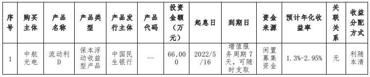 近日,公司向中國民生銀行股份有限公司洛陽分行(簡稱“中國民生銀行”)申購1筆“流動利 D”業(yè)務(wù),金額 66,000 萬元,子公司中航光電(廣東)有限公司(簡稱“廣東公司”)向中國建設(shè)銀行股份有限公司洛陽分行(以下簡稱“中國建設(shè)銀行”)申購 1 筆結(jié)構(gòu)性存款,金額 81,000萬元,主要情況如下: