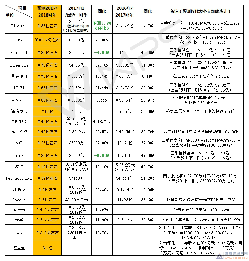 ICCSZ訊(編輯:Debi)時值農(nóng)歷年辭舊迎新時刻,恰逢新歷2月初,正是國內(nèi)外上市公司發(fā)布財報/預(yù)告的時候,光通信行業(yè)上市公司的財報理所當(dāng)然地吸引了業(yè)界眼球。本文簡單匯總了截至發(fā)稿前已公布財報或預(yù)測報告的上市公司營收情況,并補(bǔ)充小編了解到的一些非上市公司的年?duì)I收情況,為方便對比,年?duì)I收統(tǒng)一按人民幣表示。
